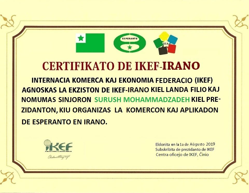 Irano Fariĝas Oficiala Filio de Esperanto-Komercistoj IKEF Delonge komencis sian Esperanto-bazitan kompanion en Irano kaj unue komencis labori en Esperanto ĉe la Monda Kongreso de Esperanto-Komercistoj